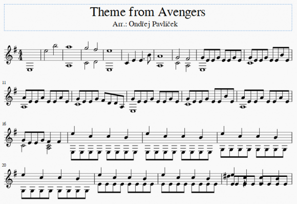 Theme from Avengers- kytara sólo, standardní notace, jednodušší verze. Na přání tabulatura.